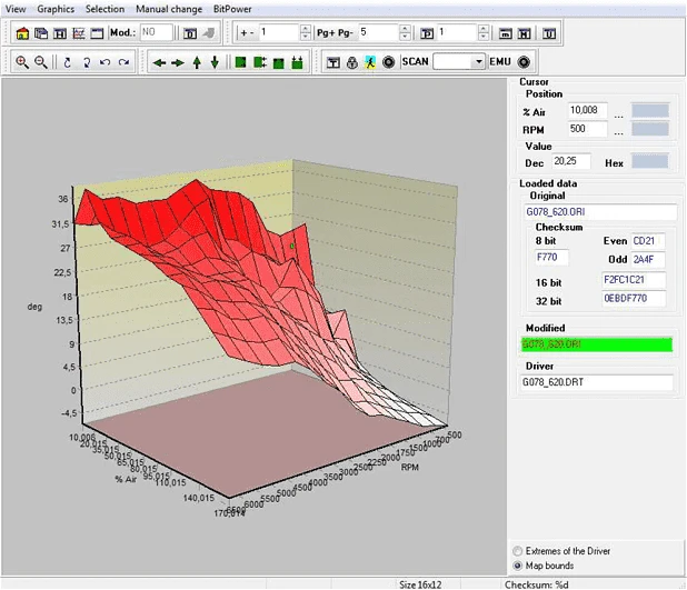 Display the selected map in a three-dimensional graph, with 3 reference axes x,y and z. The 3D view will allow the form and the development of the map; you can so linearize the representation, modifying the values point by point so to make the engine response more uniformed and smooth. You will be also able to increase or decrease specific areas to improve the vehicle performance.