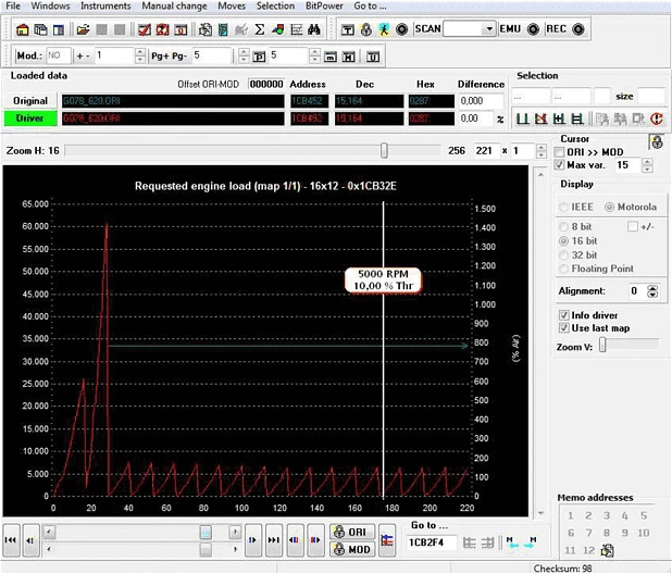 Visualize the selected map in a two-dimensional graph in a coordinated system. Through the 2D view, you will have the chance to explore the entire original file to search for one or more maps you want. You will be able to modify any parameter in the loaded map. And thanks to the feature Memo addresses you can memorize the addresses of the maps so that you will easily find them again later.