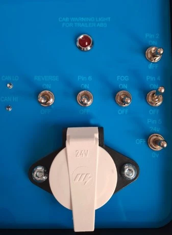 The power case is included in a self-contained 24V power box in a robust lockable case. Also included are three switchable power sockets (24N, 24S and ISO 7638), switches and warning lamps. These instruments allow to test all the electrical functions on the trailer sockets to the power box. The batteries inside the power box provide the 24 volt supply, and are re-charged using the battery-charging socket on the side of the power box.