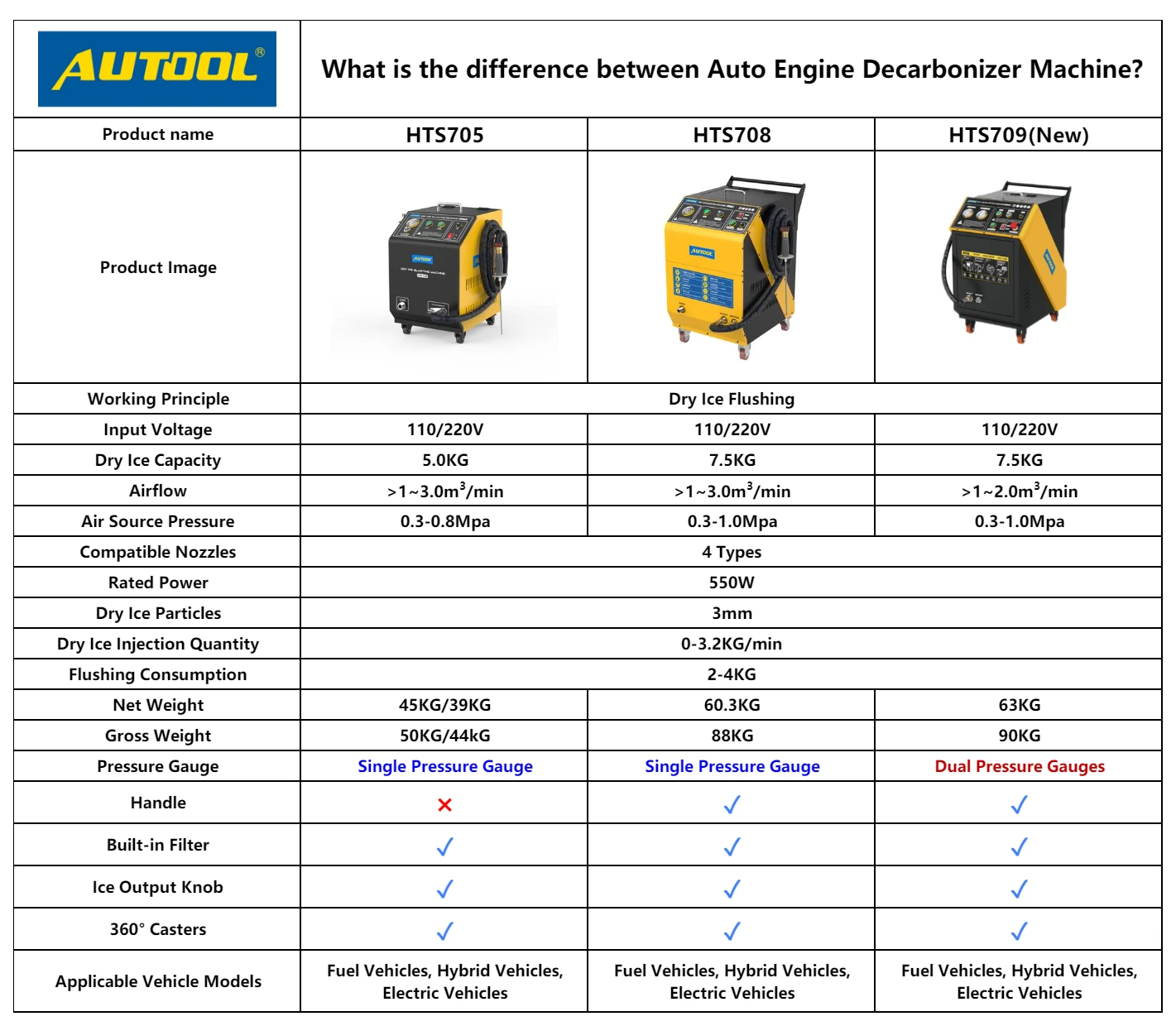 AUTOOL HTS709 automotive dry ice cleaning machine is very suitable for applications in automotive, electric power, rubber, plastic, chemical, printing, food, pharmaceutical, casting, shipbuilding and aviation and other fields, which is not limited to auto maintenance.