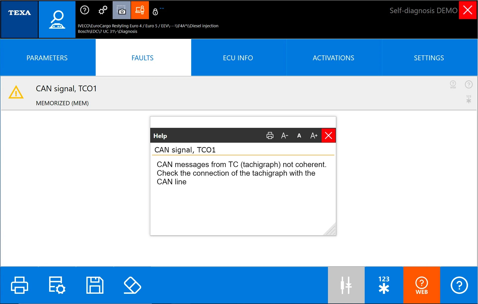 Automatic scan of all the control units installed in a vehicle that can be diagnosed(1), fast in accessing the diagnostics and identifying the control units automatically. On completion of the scan, TGS3s immediately displays any errors, along with the relevant codes and descriptions, and allows you to read and clear them with a single click. You can also launch a self-diagnostic test on the selected system directly from the error detection screen.