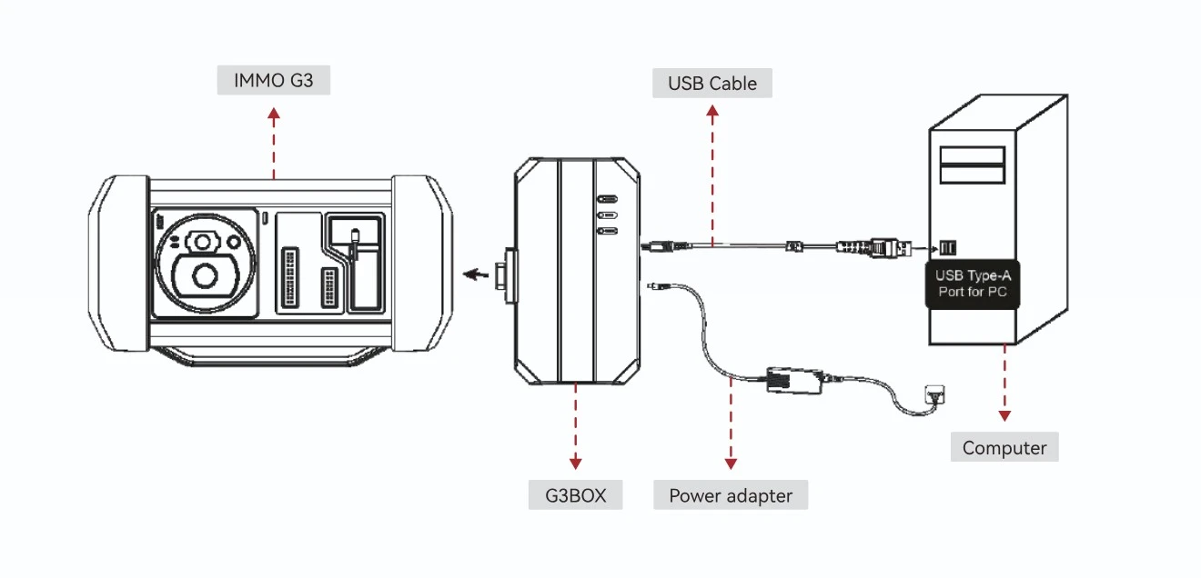 This is a hardware box designed to work together with the company’s IMMO G3 immobilizer-programmer tool. It connects to a PC via software and enables reading and writing of ECU (Engine Control Unit) Flash and EEPROM data. It also supports anti-theft data operations (such as deactivation and file verification) and is intended for use with ECUs from brands such as Volkswagen, Audi and Porsche.